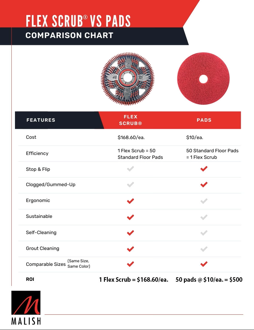 • Product cost savings up to 66% (1 Flex Scrub® at $169 vs. 50 Pads at $500)